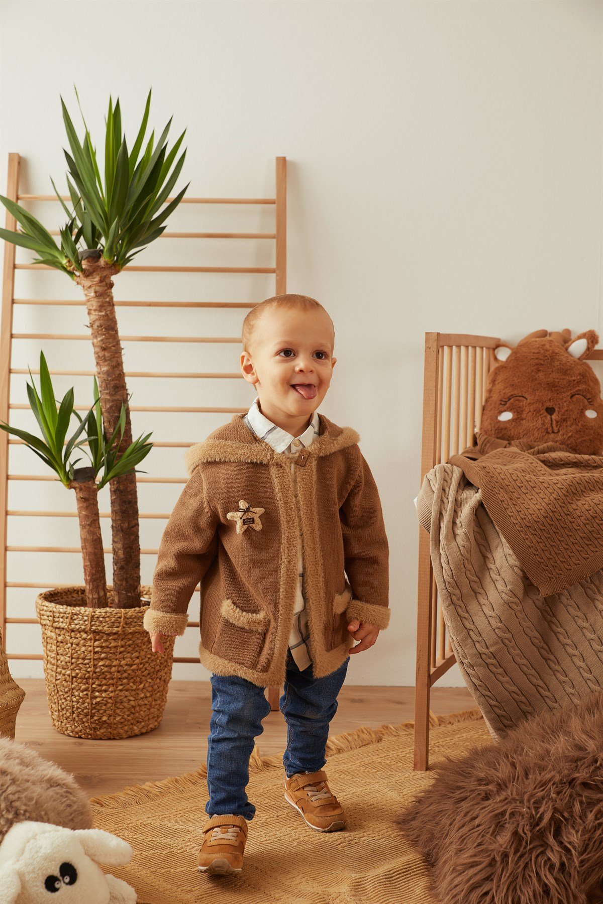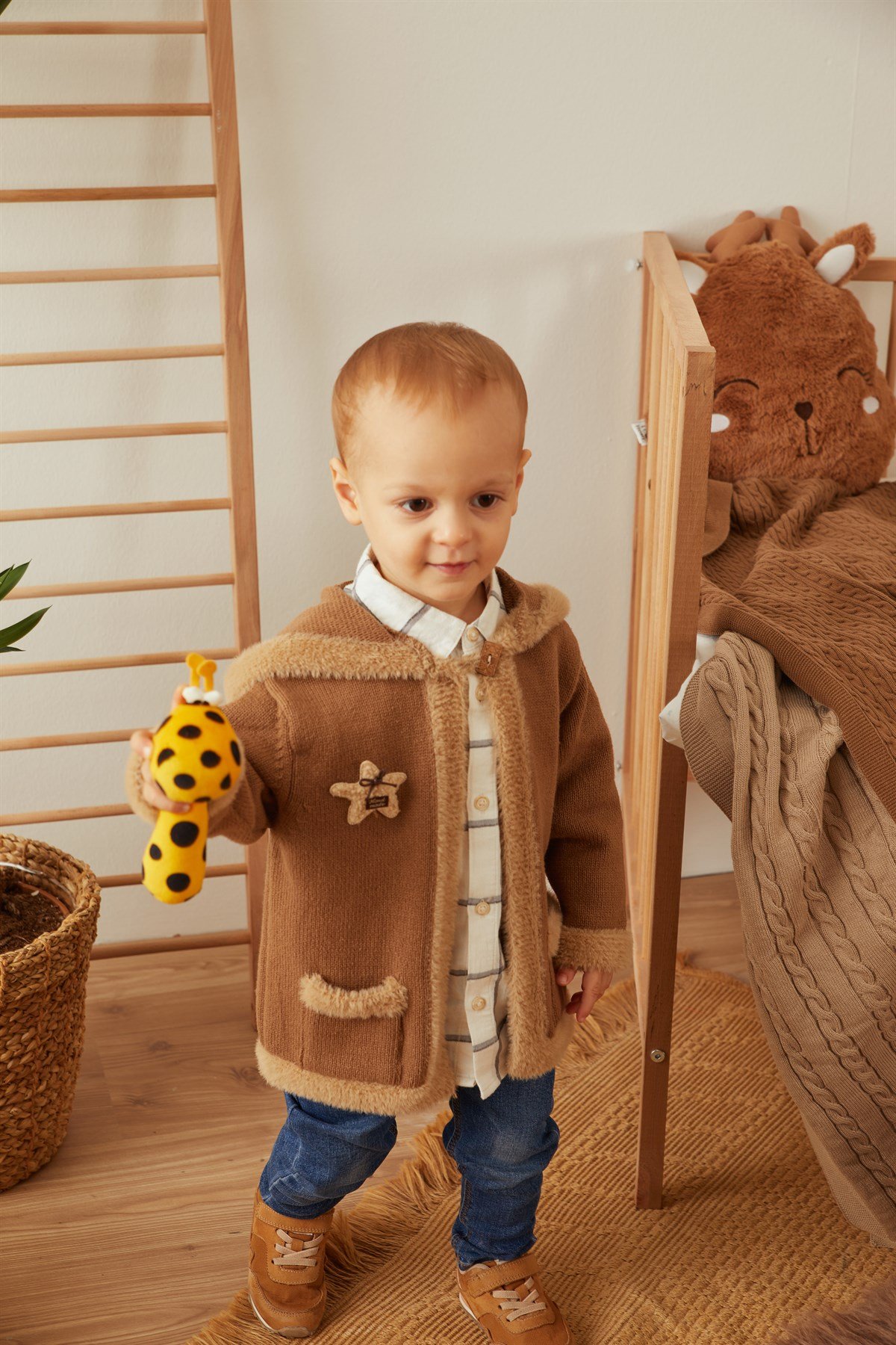 Кофейный цвет плюшевый детский кардиган с капюшоном из органического хлопка (21042)